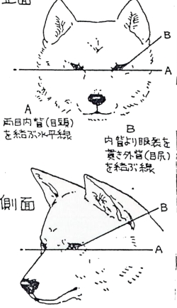好的柴犬的鼻樑線必需是一直線的。最近鼻頭隆起顯眼的例子比較多。這會減損一隻狗臉部的氣質。尤其是從側面望去時給人的感覺不太好。整體說來口吻間長的比較好,相反地,鼻頭凹下也不好。